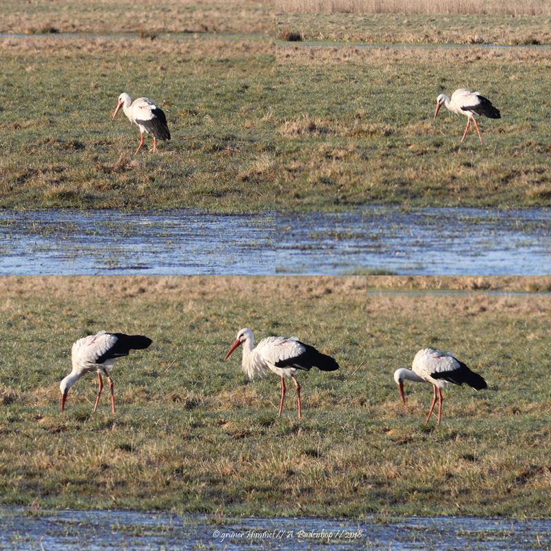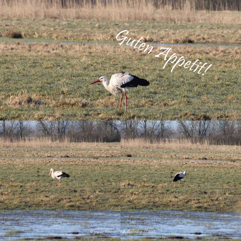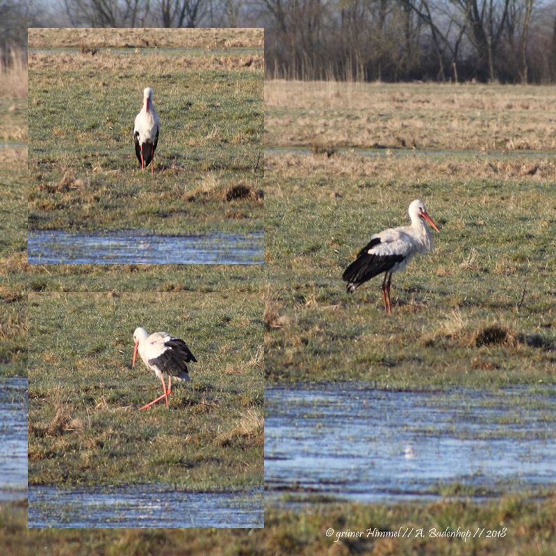 Die Wiese auf der Adebar da unterwegs ist, liegt direkt hinter dem Dorf. Sie ist umgeben von Gräben und es gibt immer mal wieder Überflutungen, wie ihr sie auf dem Bild sehen könnt. Und genau auf solchen Wiesen findet der Weißstorch die Nahrung, die er mag. Frösche, kleine Reptilien, Mäuse, Insekten…
